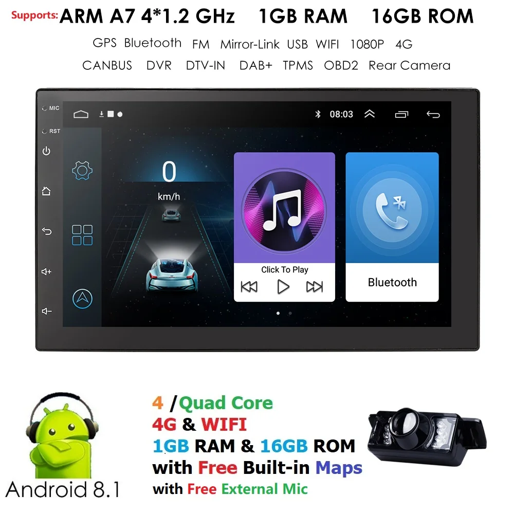 7'' inch Quad Core Android 5.1 GPS Navigation HD Display Car Double Din Radio Audio WIFI 4G Auto no DVD Multimedia Player+camera